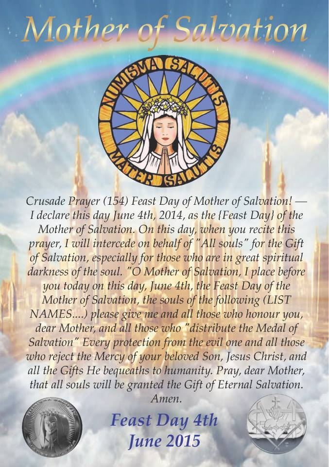 O Mother of Salvation, I place before you today on this day, June 4th, the Feast Day of the Mother of Salvation, the souls of the following (list names).